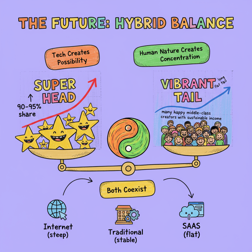 技术创造了长尾的可能,而人性与市场规律又将系统拉回帕累托分布。长尾不会消失,但头部也将更加强大。